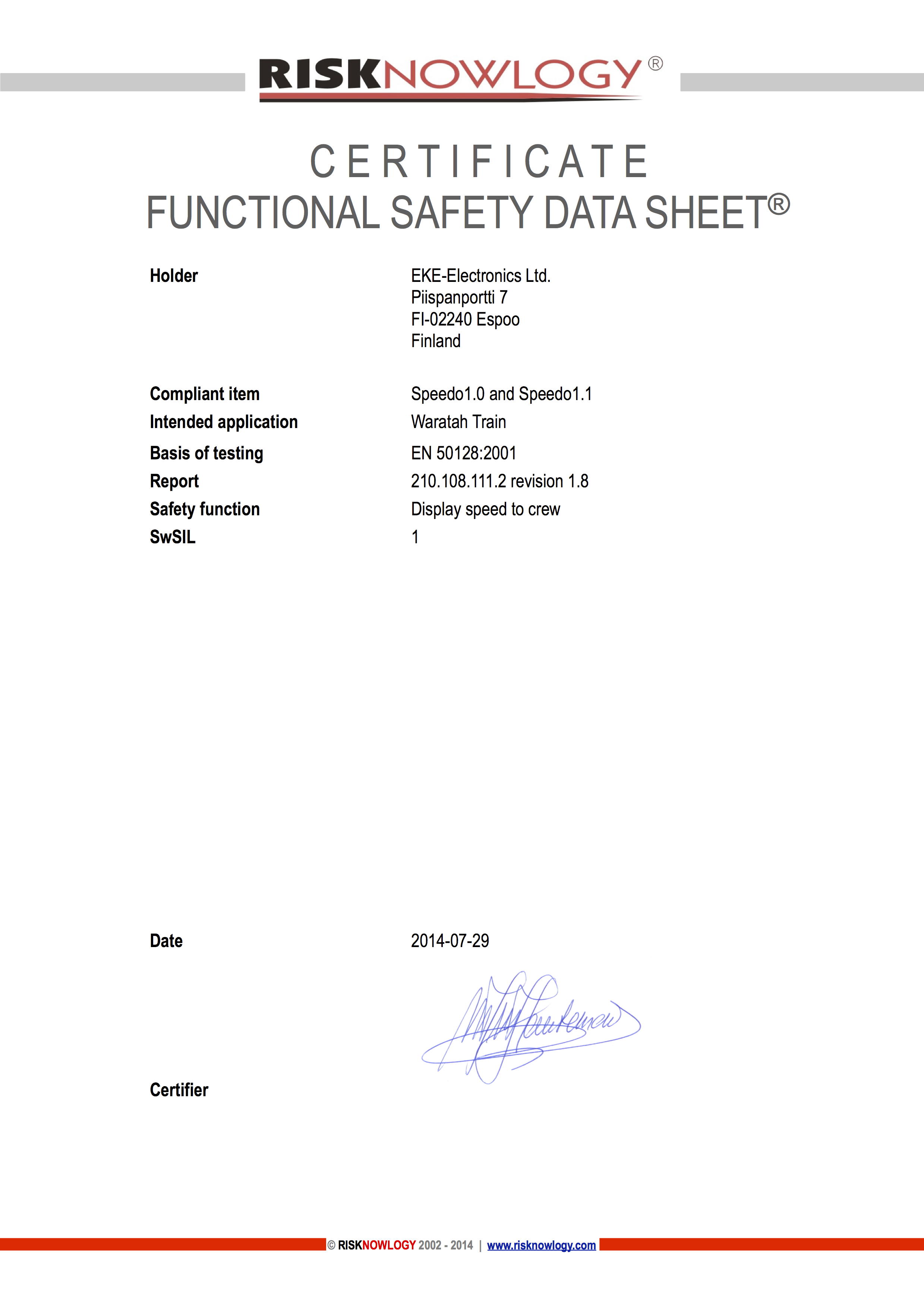 The EKE Speedo1.0 and Speedo1.1 monitor the speed on a train and display the correct speed to the driver. The Speedo1.0 and Speedo1.1 software is SIL 1 compliant with EN 50128