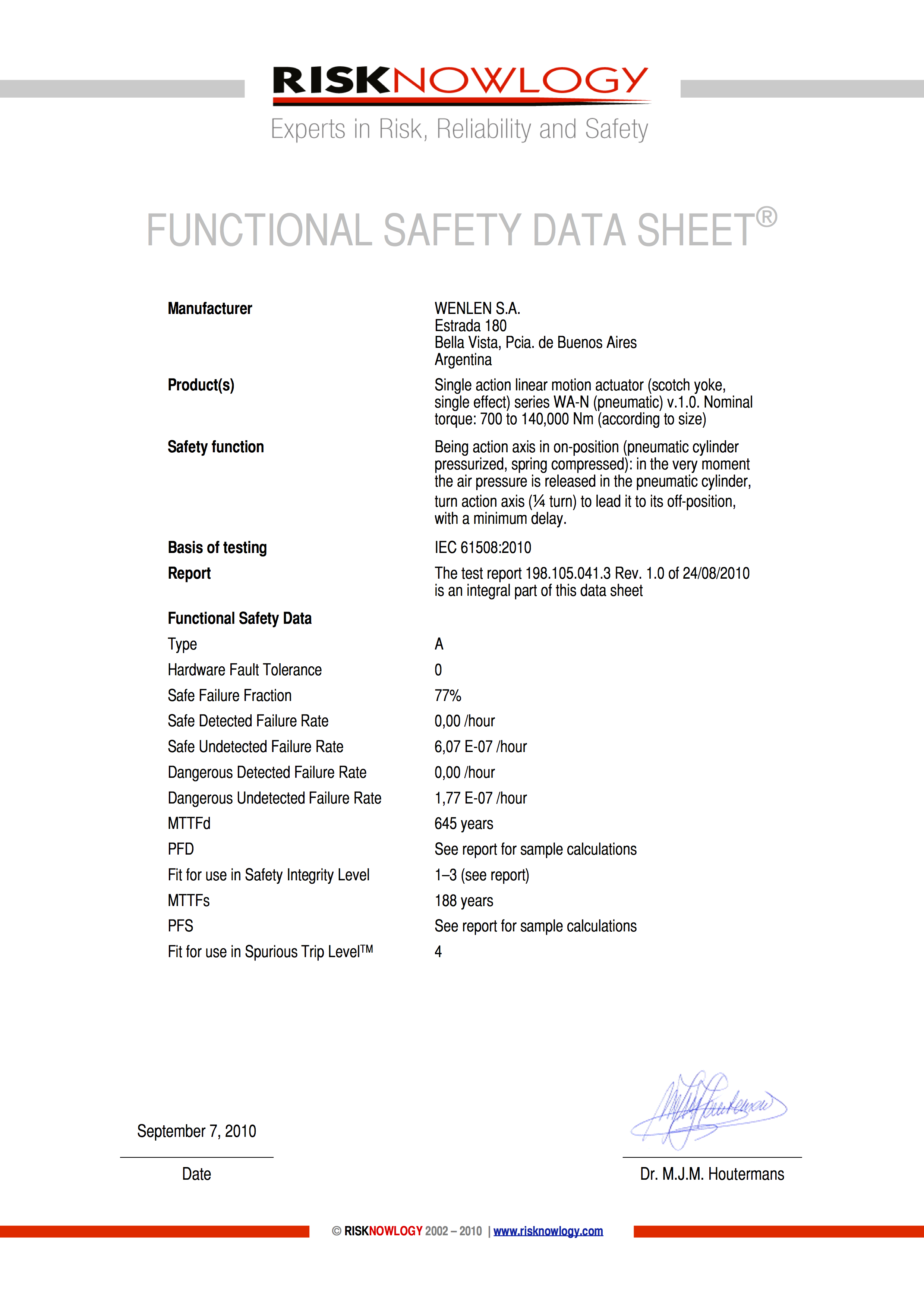 The Wenlen WA-N Actuator series is certified according to IEC 61508. The certification addressed the reliability parameters of the actuator. The actuator meets SIL 3 and spurious trip level STL 4.
