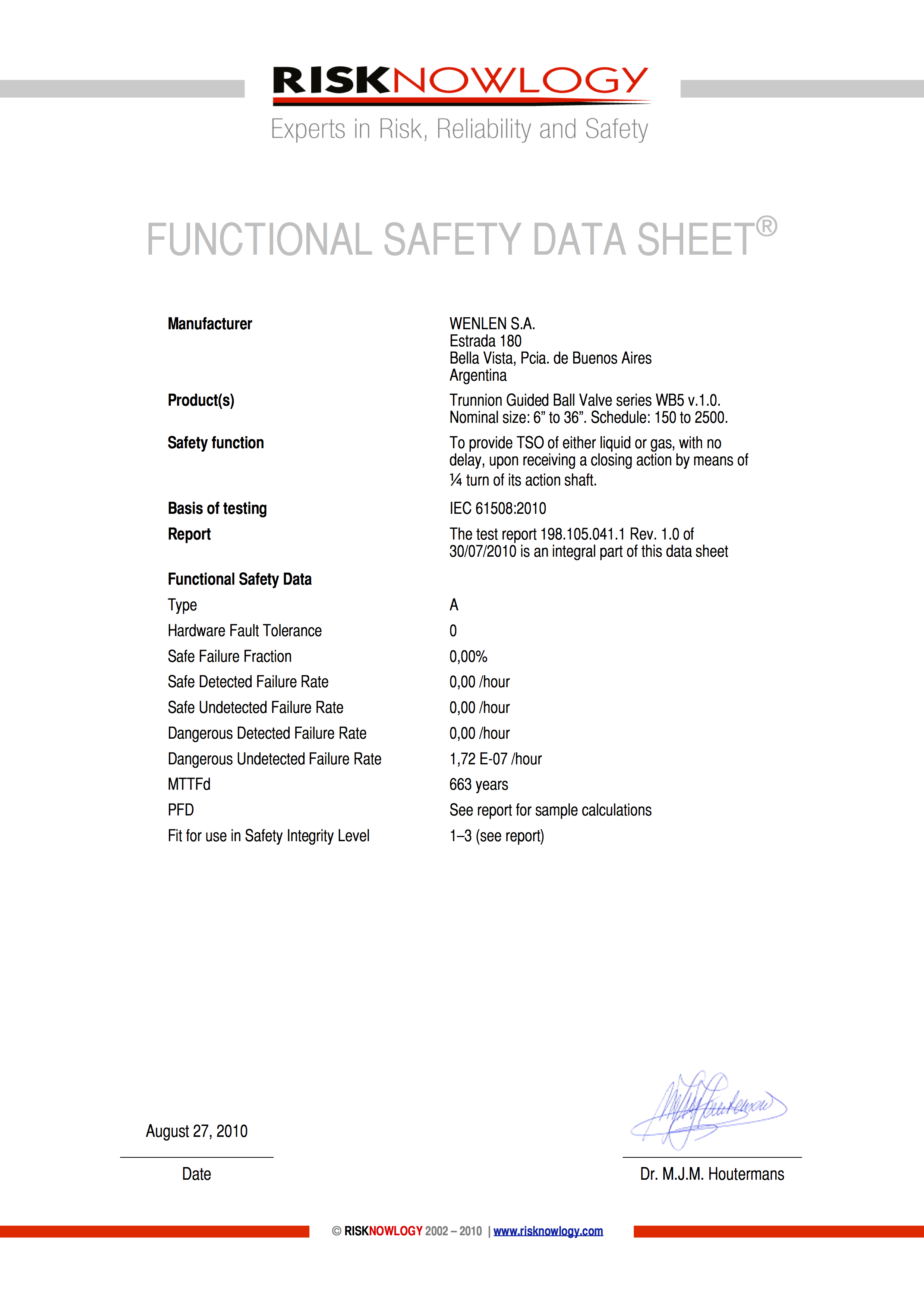 The Wenlen Trunnion Ball Valve WB5 series is certified according to IEC 61508. The certification is based on reliability analysis. The product achieved SIL 3.