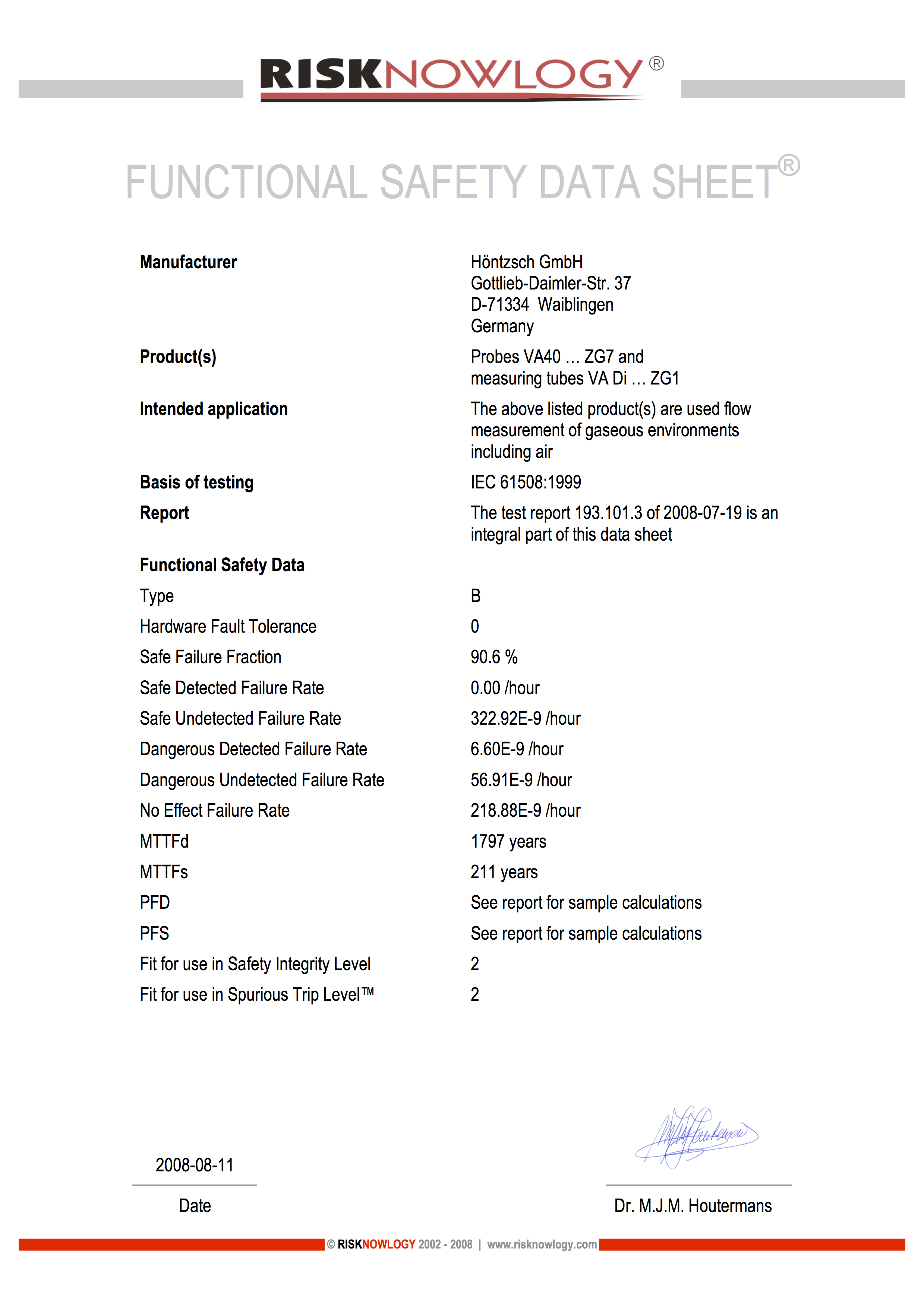 The Hoentzsch VA40 ZG7 - 55 is certified according to IEC 61508. The products is used for flow measurement of gaseous environments including air. The product is fit for use in SIL 2 and Spurious Trip Le