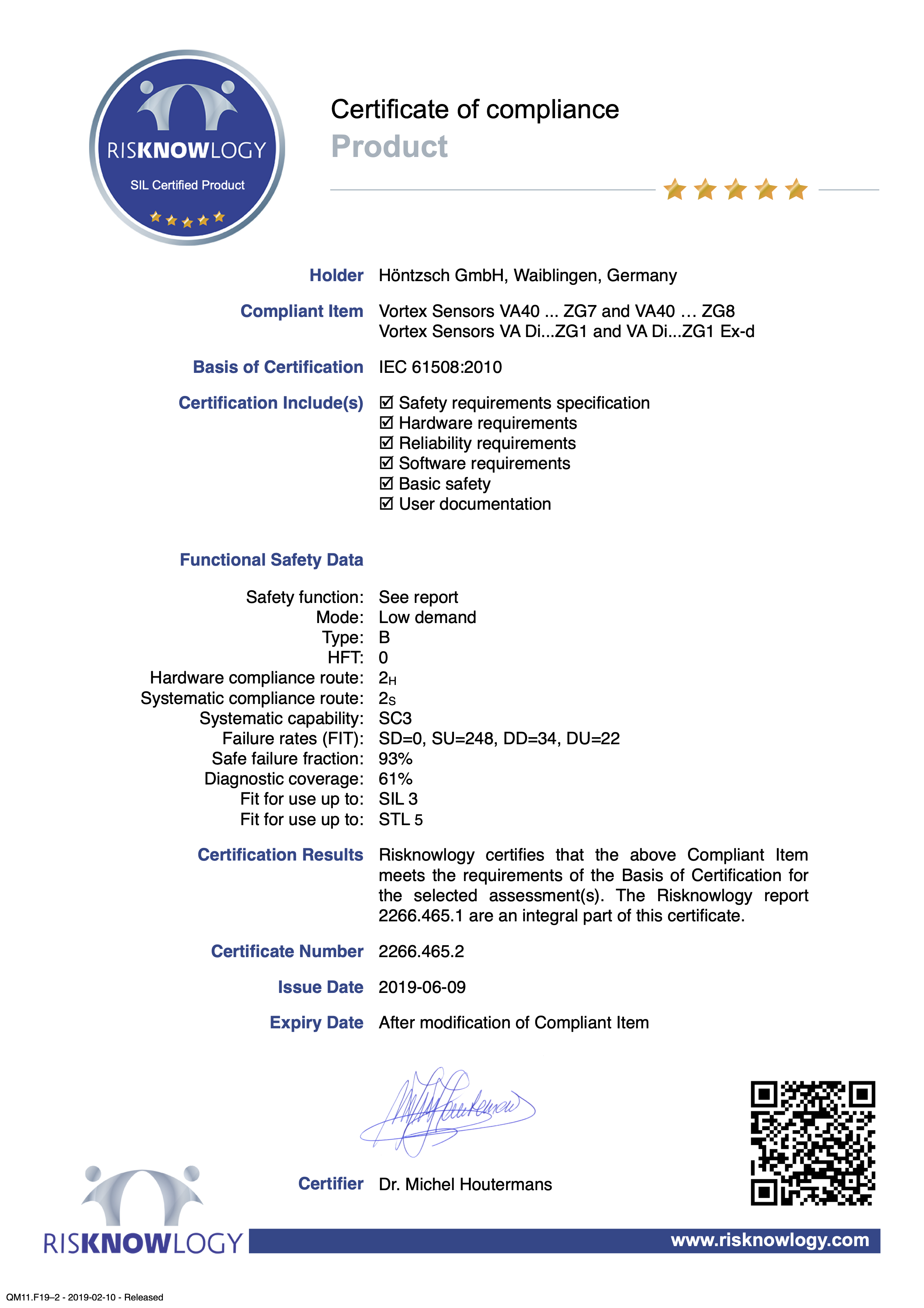 Risknowlogy certified the Hoentzsch vortex sensors. The SIL Vortex Sensors VA40 - ZG7 and ZG8 are compliance with SIL 2 according to IEC 61508. The certification was based on proven in use. With a systematic capability of SC3 the vortex sensors can be used in SIL application when HFT=1.