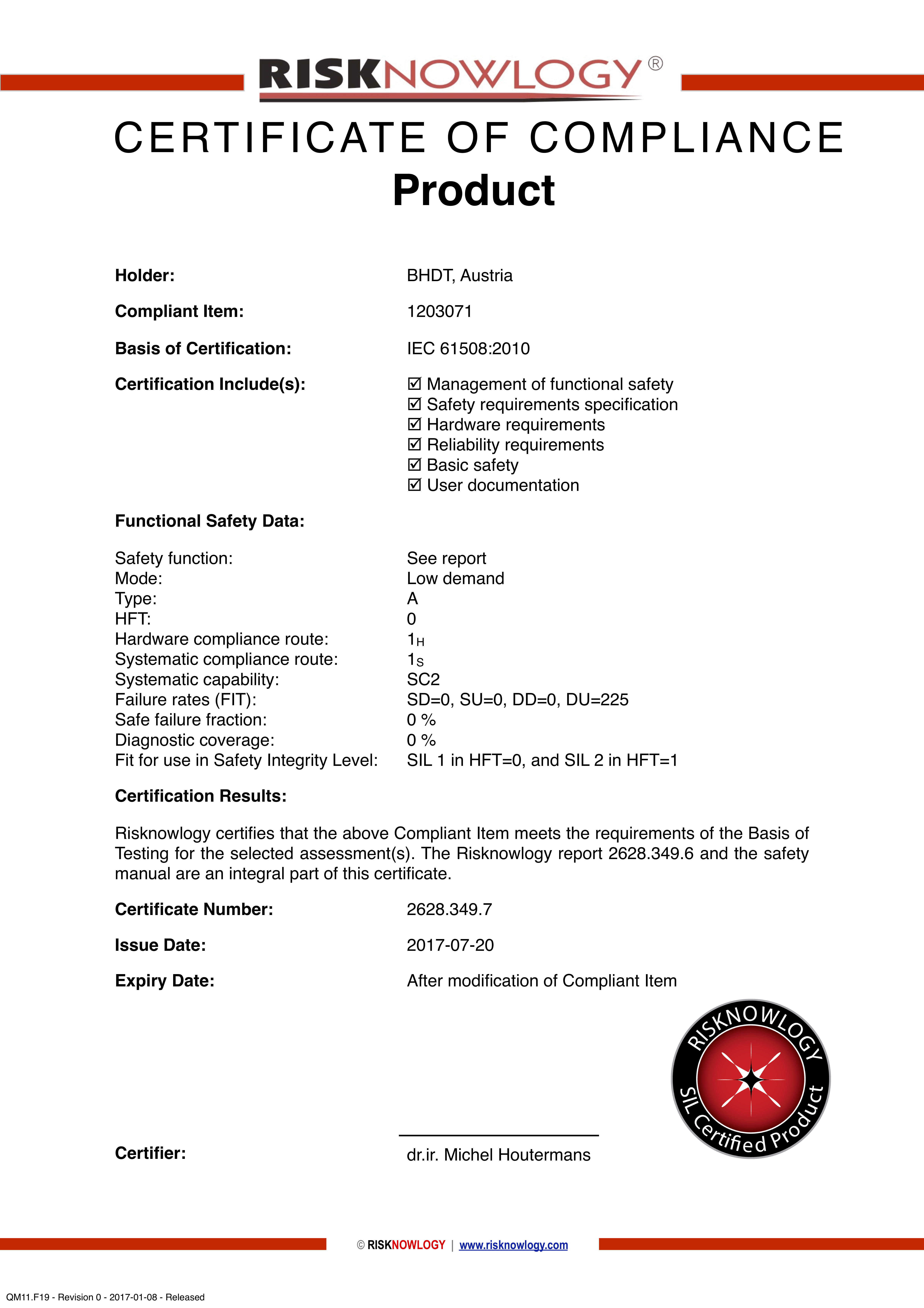 Risknowlogy certified valve 1203071 according to IEC 61508 addressing: