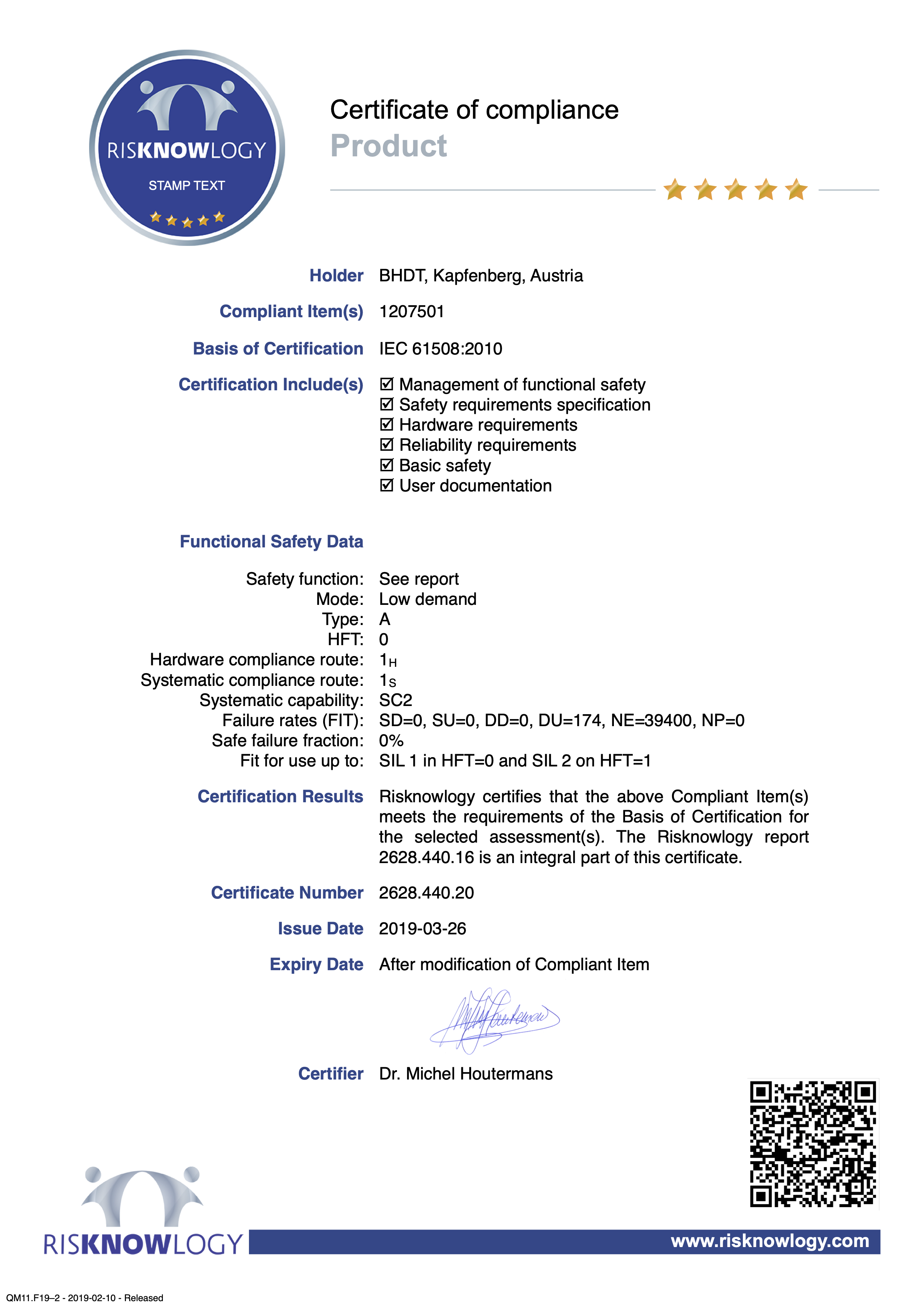 Risknowlogy certified the BHDT Valve according to IEC 61508 on SIL 1 and 2 levels. The certification includes: