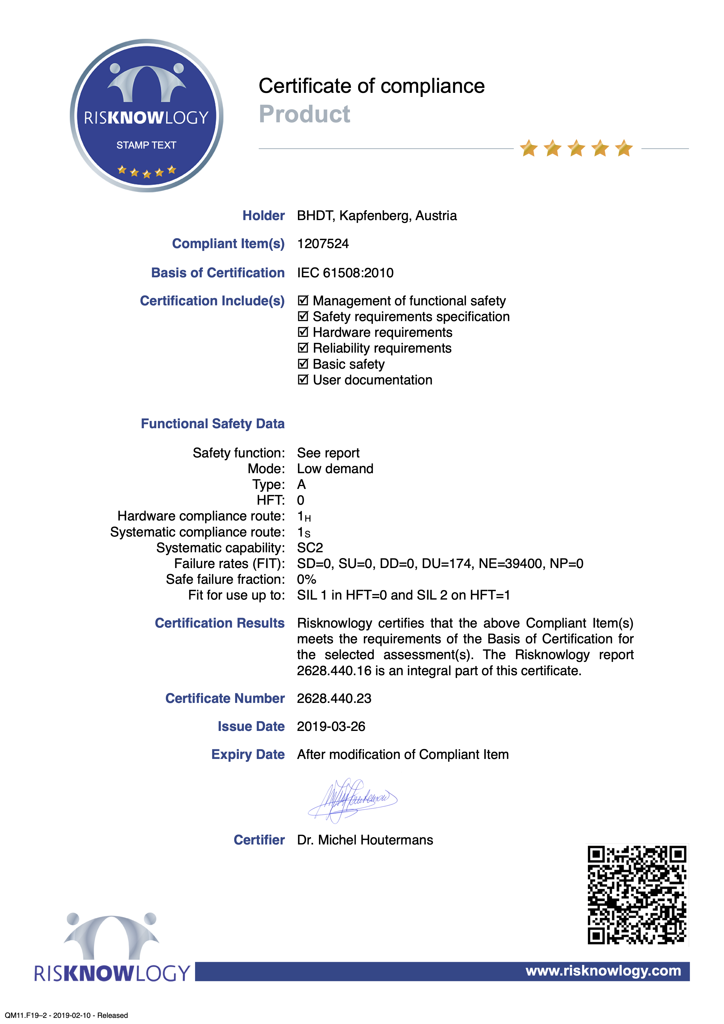 Risknowlogy certified the BHDT Valve according to IEC 61508 on SIL 1 and 2 levels. The certification includes:
