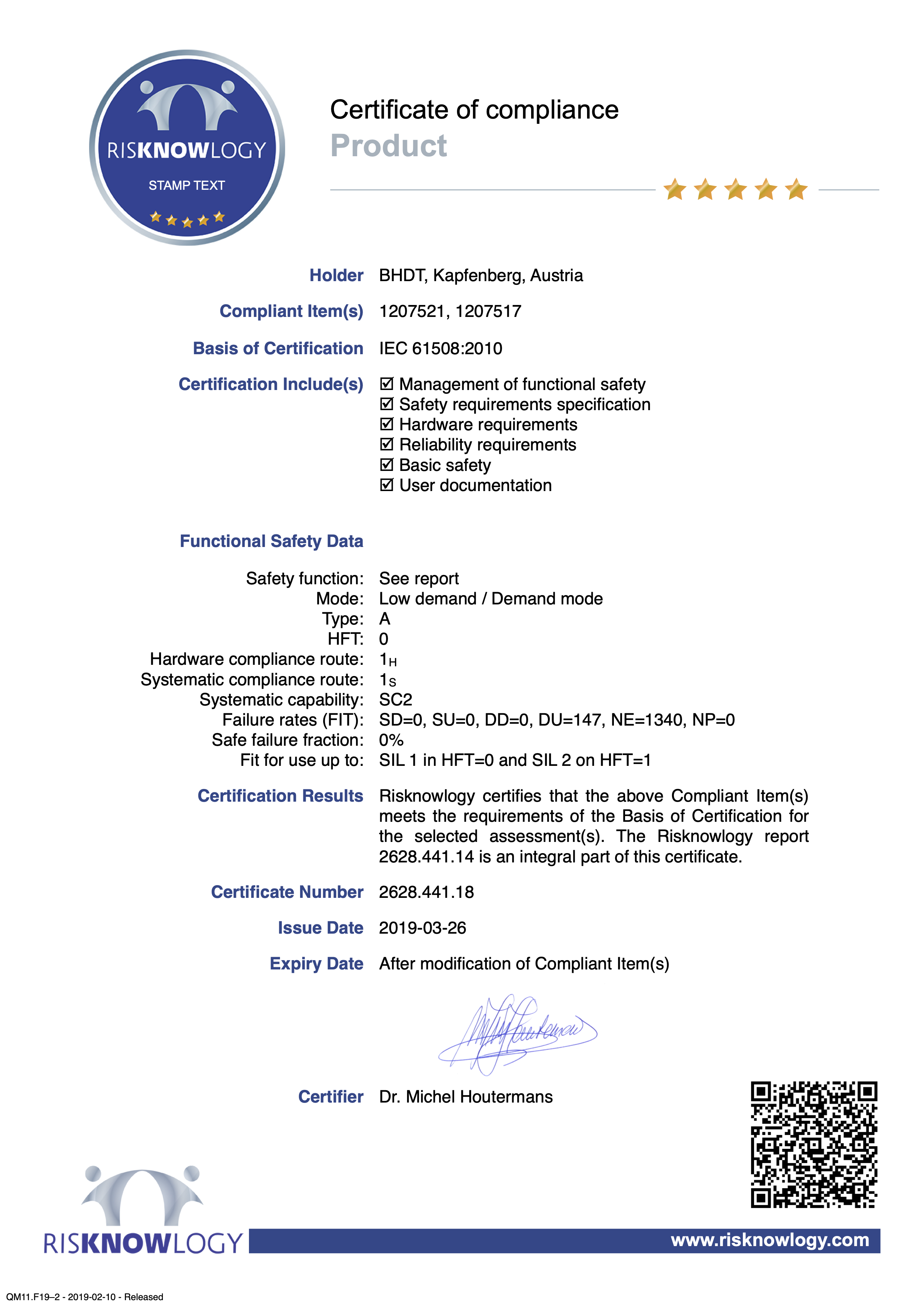 Risknowlogy certified the BHDT Valve according to IEC 61508 on SIL 1 and 2 levels. The certification includes: