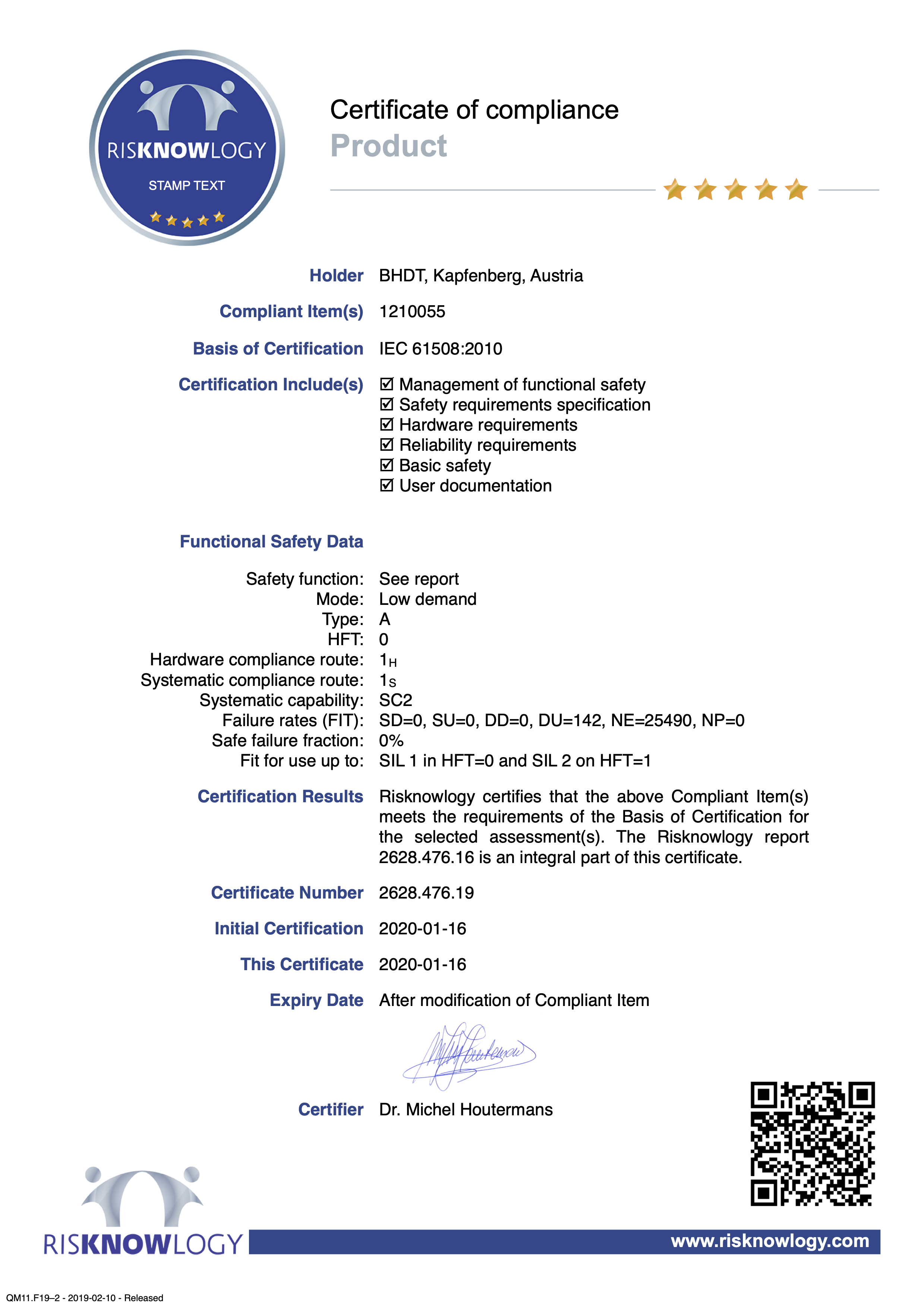 Risknowlogy certified the BHDT Valve according to IEC 61508 on SIL 1 and 2 levels. The certification includes: