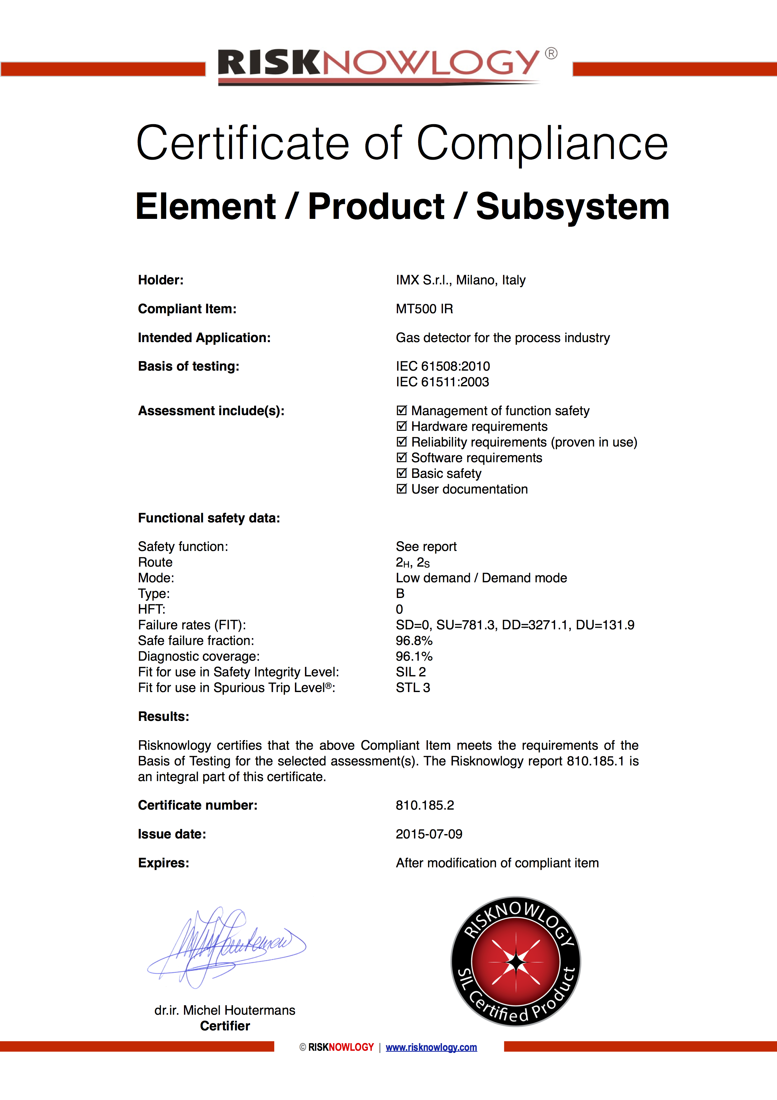 The IMX MT500 IR is certified according to IEC 61508. The certification included: